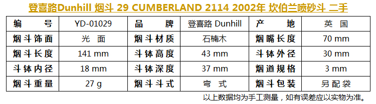 登喜路Dunhill 烟斗 29 CUMBERLAND 2114 2002年 坎伯兰喷砂斗