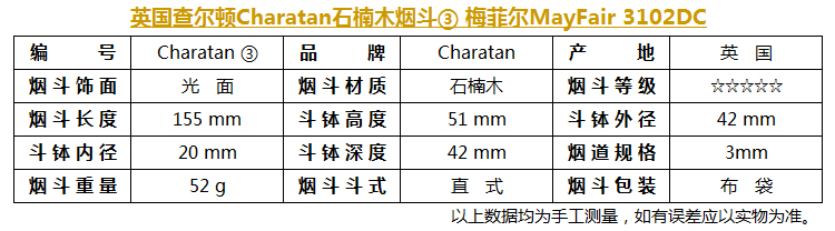 戮记:CHARATAN/MAYFAIR/3102DC/REGD NO 203573全新未使用。斗口有撞击痕,斗身有个别小撞痕,有2,3处小沙眼,未发现补土。斗嘴有可能在使用后有氧化现象,可使用一段时间后再打磨处理。