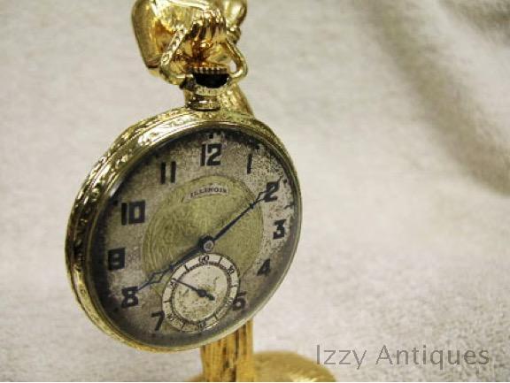 《 Illinois伊利诺斯 14K绿金包金 金属花式表盘 古董 开面怀表 》