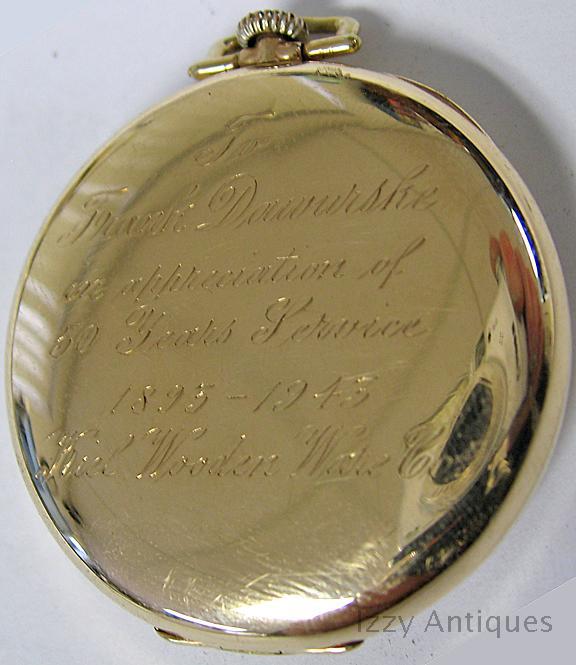 品牌:Elgin 产地:美国 表壳:包金表壳 后盖上有“To Frank Dawerske In Appreciation Of 50 Years Service 1893-1943 Kiel Wooden Ware Co.”赠送铭文 表盘:金色金属表盘 黑字 蓝钢指针 机芯:原装11占手卷机芯 新近洗油保养 走时很好 调时:表把调时 尺寸:12S 直径42mm(不连表把) 编号:23102531 年代:1921 有心仪的买家请仔细看图自鉴品相