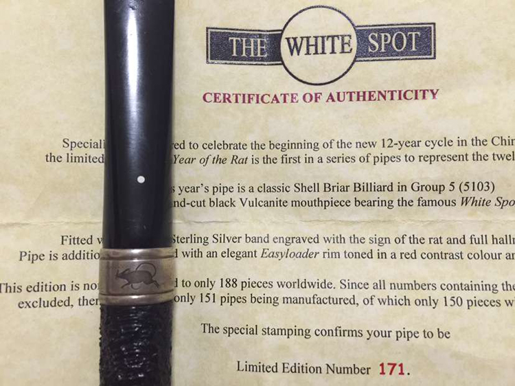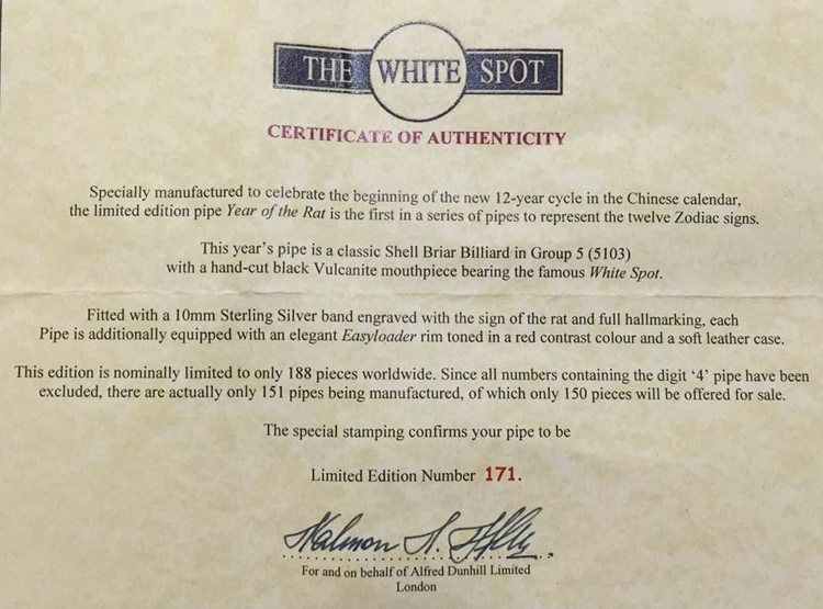 此款鼠年纪念版烟斗是英国登喜路Dunhill首年生肖纪念 版。全球限量版 188把 此把为171把 包含:原厂包装盒/纪念版专用真皮烟斗包/鼠年纪念说明图