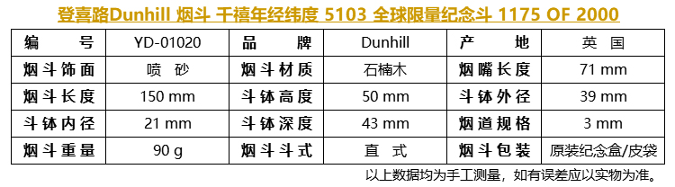 《 登喜路Dunhill 烟斗 千禧年纪念斗 经纬度 5103 全球限量 No.1175 》
