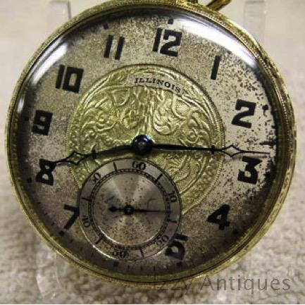 Illinois伊利诺斯 14K绿金包金 金属花式表盘 古董 开面怀表