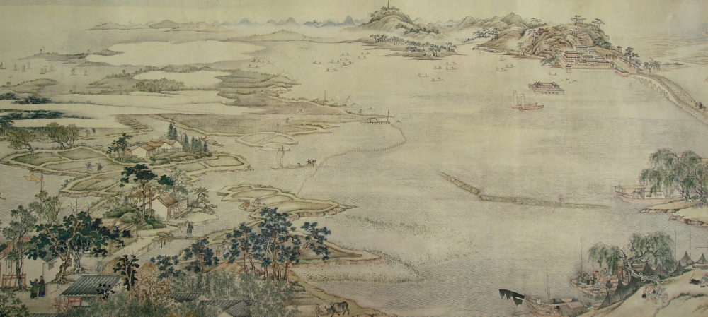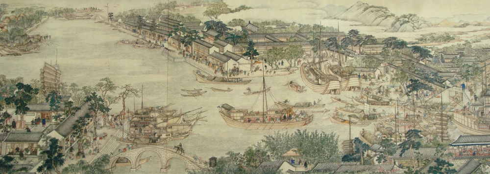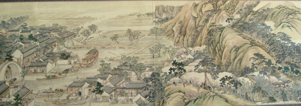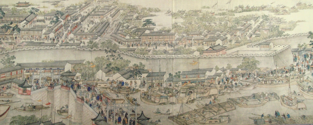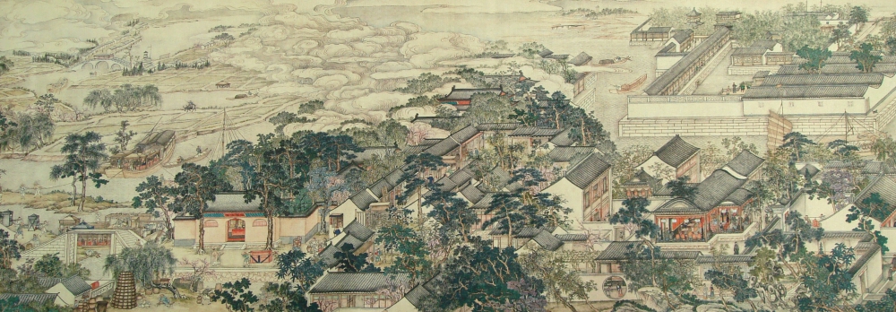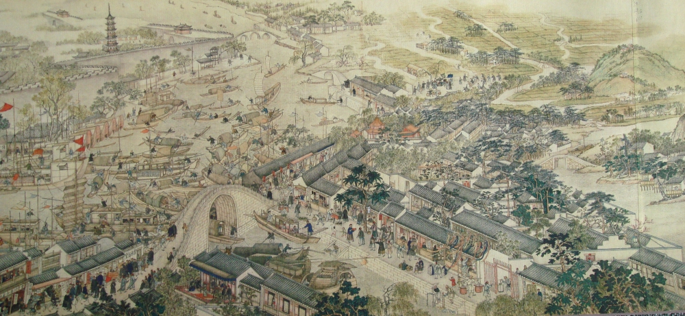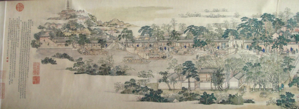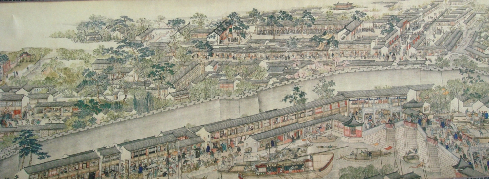 * 清乾隆二十四年(1759年),擅长人物、花鸟草虫的苏州籍宫廷画家徐扬用了24年时间创作了一幅名为《盛世滋生图》,以长卷形式和散点透视技法,反映当时苏州"商贾辐辏,百货骈阗"的市井风情,又名《姑苏繁华图》,进献乾隆皇帝,以赞乾隆盛世。这是继宋代《清明上河图》后的又一宏伟长卷,全长1225厘米,宽35.8厘米,比《清明上河图》还长一倍多,现为国家一级文物。 作品内容 画面自灵岩山起,由木渎镇东行,过横山,渡石湖,历上方山,介狮和两山间,入苏州郡城、经盘、胥、阊三门,穿山塘街,至虎丘山止。作者自西向东,由乡入城,重点描绘了一村(山前)、一镇(苏州)、一街(山塘)的景物,画笔所至,连锦数十里内的湖光山色、水乡田园、村镇城池、社会风情跃然纸上。 粗略计算,全幅画有各色人物1万2千余人,各色房屋建筑约2140余栋,各种桥梁50余座,各种客货船只400余只,各种商号招牌200余块,完整地表现了原作中气势宏伟的古城苏州市井风貌,是研究250年前"乾隆盛世"的形象资料,具有极大的历史价值。 画卷布局精妙严谨,气势恢宏,笔触细致,十分细腻地刻画出了江南的湖光山色、田园村舍、阊胥城墙、古渡行舟、沿河市镇、流水人家、民俗风情官衙商肆,描绘了苏州城郊百里的风景和街市的繁华景象,形象地反映了18世纪中叶苏州风景秀丽、物产富饶、百业兴旺、人文荟萃的繁盛景象,具有很高的艺术鉴赏价值