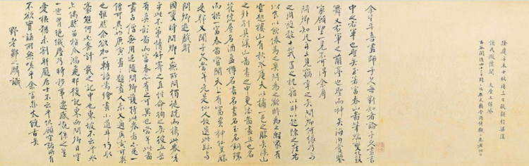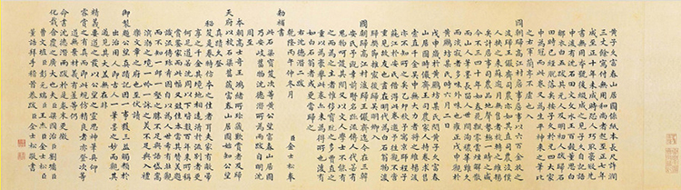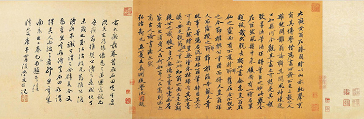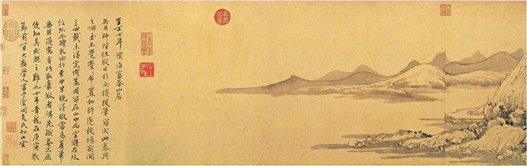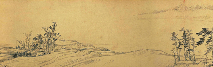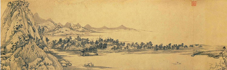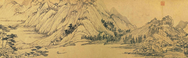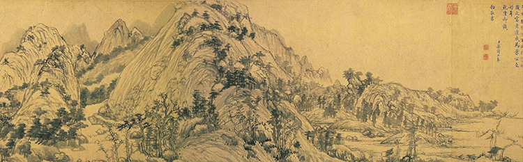 作品内容 《富春山居图》原画画在六张纸上,六张纸接裱而成一副约七百公分的长卷。而黄公望并没有一定按着每一张纸的大小长宽构思结构,而是任凭个人的自由创作悠然于山水之间,可远观可近看。这种浏览、移动、重叠的视点,或广角深远,或推近特写,浏览过程中,视觉观看的方式极其自由无拘,角度也非常千变万化。 第一部分:剩山图从一座顶天立地浑厚大山开始,长篇巨制,拉开了序幕,图画上峰峦收敛锋芒,浑圆敦厚,缓缓而向上的土堆,层层叠叠渐进堆砌着,又转向左方慢慢倾斜,黄公望使用他最具独特见长的“长披麻皴”笔法,用毛笔中锋有力向下披刷,形成画面土壤厚实的质地,山岚白色雾气迷蒙,表现出江南山水湿润的独特气候之特色。 第二部分中所画的山脉的发展变化发生了转折,随着山脉的层次变化,画中的树木、土坡、房屋和江中泛起的小舟更有一种层峦环抱、山野人家的萧瑟感。隔着一段水路第二部分也将进入尾声,主体的山峦在左边,群山全都呼应在左面,而近处的松柏微微摆动至右,遥相呼应远处的大山,承先启后,路转峰回。 由第二部分至第三部分也是墨色变化最大,空间变化最丰富,第二部分也是呼应第三部分开始,黄公望画笔突转,略用皴染的坡与平静的江面,又向后延伸,画面由密变舒,疏离秀丽,又用浓墨细笔勾勒出画中水波、丝草,阔水细沙,风景灵动。水是从哪里来,是从天空的云出来的,唐诗里面讲“行到水穷处,坐看云起时”,如果你跟着画面走,在富春江上水的穷绝之处就是它的水口,然后你觉得穷是绝望,可是这个时候应该坐下来,看到云在升起来,而云气刚好是生命的另外一个现象。所以黄公望也把这些哲学、文学的东西变成山石、水沙跟云起之间的互动关系。 第四部分,全篇画作笔墨最少,没有皴染,只有山,只有水,还原了自然的本真,构图上跨越第五部分,一片水沙,一段最长的留白,如同一年四季,时间流逝,岁月匆匆。画中点点枯苔小树土坡,河岸边的小桥连接着第五部分,而《富春山居图》这六个部分也像极了春夏秋冬,从前三部分的繁华葱荣、大气磅礴,到第四部分如同时间中的秋冬,静观万物,繁华落尽,肃静苍茫。 第五部分至第六部分中宽远的白沙,留白处两艘小船并行江中,船上渔夫也只是点景,微小的身影,渺小的生命,在整片的留白中,一如一颗尘埃。远处一片远山,笔的线描,墨的拖带,交织在一起,一直延续在后面的大段留白中。