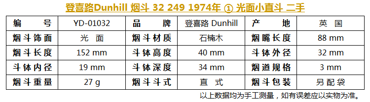 《 登喜路Dunhill 烟斗 32 249 1974年 ① 光面小直斗 二手 》
