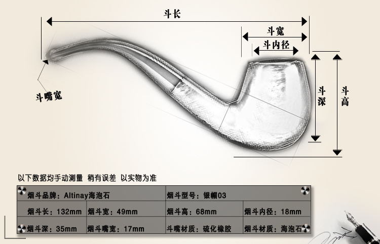 材质:海泡石 烟斗长度:132 mm 斗钵高度:68 mm 斗钵外径:49 mm