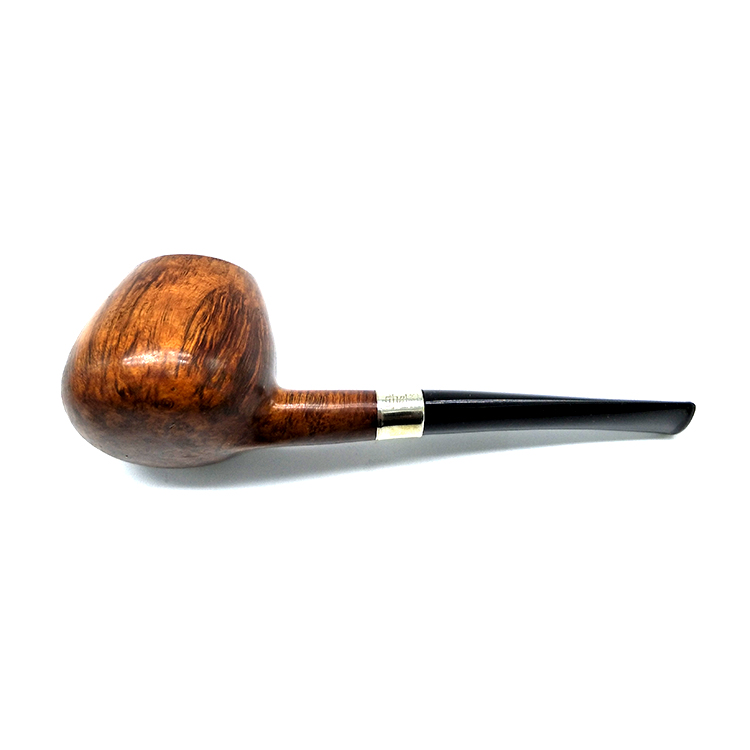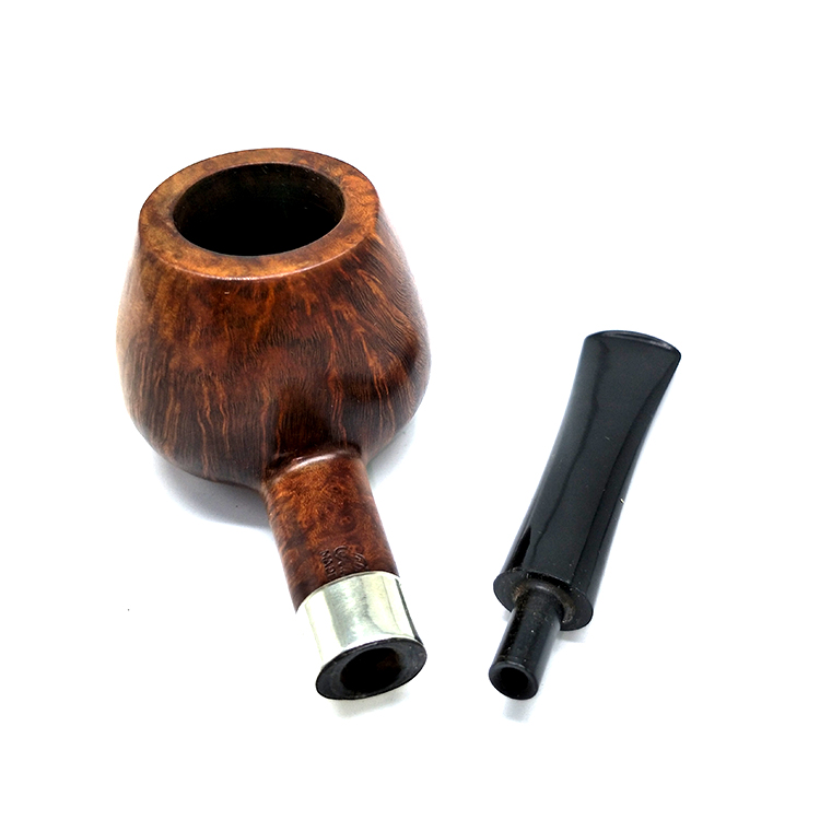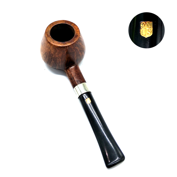 自藏的这把Peter Stokkebye烟斗,金盾标记说明出自Jorgen Larsen之手,造型虽很传统,但是非常耐看,宽大的斗钵配搭细扁的斗柄,连接角度的过渡很有味道,火焰温婉、雀眼细密。 这把斗的斗柄有裂,所以后加银圈固化了强度,其上的标志(hallmark)也是一个盾牌。因为加了银圈,故只能看到一半Peter Stokkebye的花体戳记,余者无法看到了。 常时不怎么用,钵内状况很好,咬嘴也没什么齿痕。