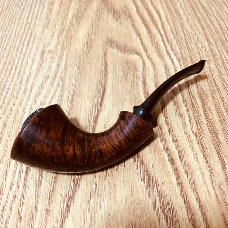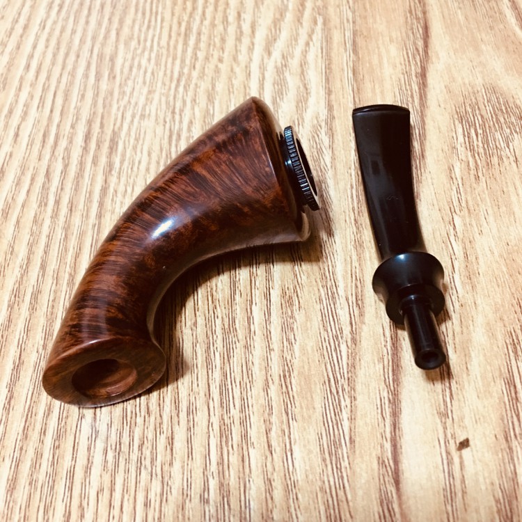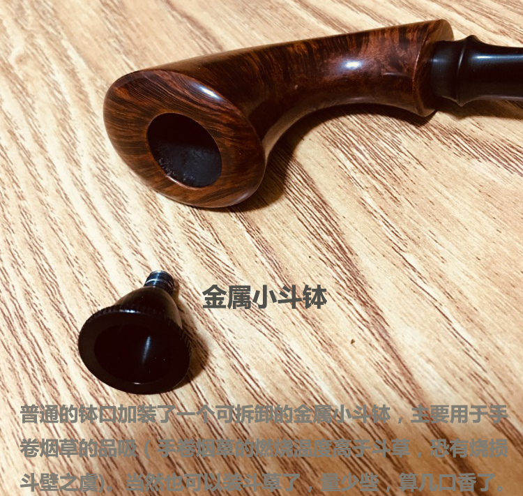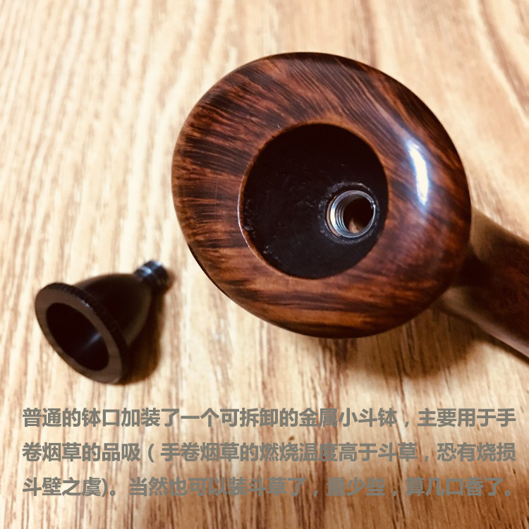这款烟斗属于斗草和手卷烟草双用款型的烟斗,工艺较之普通烟斗复杂了许多,菊池姐姐自称“也只做过两只,可能以后也不会再做了……”,属于值得菊粉属意的稀缺品了。 “微烟斗口”是指普通的钵口加装了一个可拆卸的金属小斗钵,主要用于手卷烟草的品吸(手卷烟草的燃烧温度高于斗草,恐有烧损斗壁之虞),当然也可以装斗草了,量少些,算几口香了。