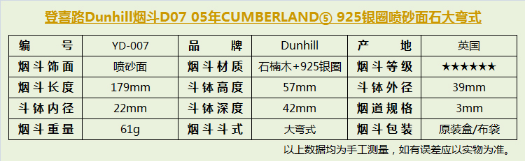 Cumberland (坎伯兰):在1980年开始的制程(是Dunhill自己发明的),通常较为偏红色,较特殊的是斗嘴部分采用一种俗称Cumberland的材质,为黑中带红,其硬度在一般的硫化硬胶与合成树脂之间。